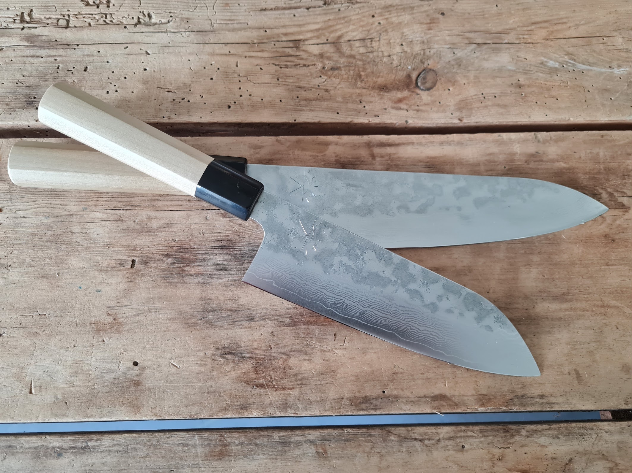 KHOCHO knive med en kerne af VG-10 stål med et blødere lag af rustfri stål som ved Nashiji bladende giver det flotte damascus mønstret eller AUS-8 enkeltlags knivblade.